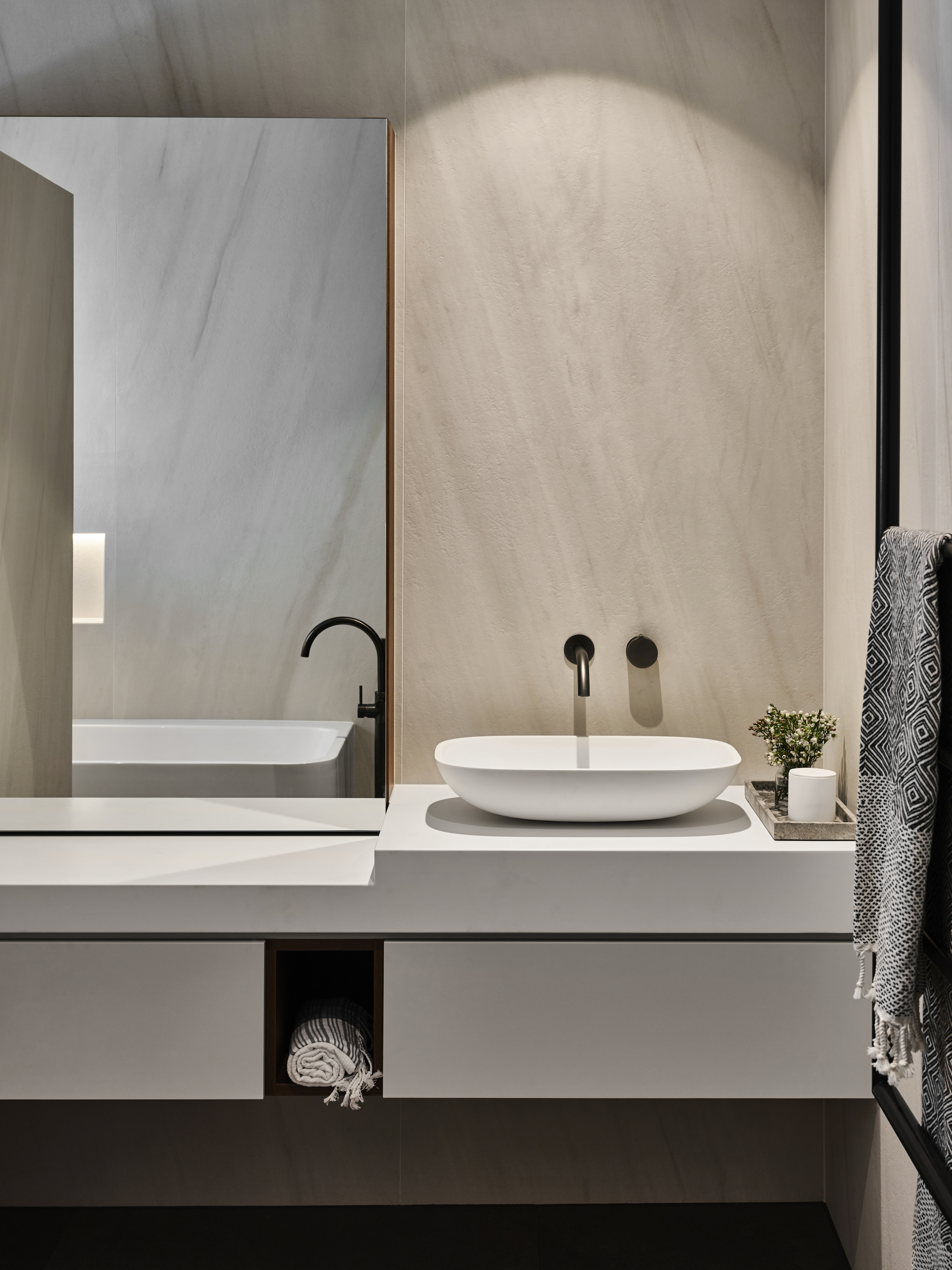 Black Satin finished tap wear and hanging towel rail act as a bold feature in the space, as they add both movement and depth to the organic grey toned scheme. The Corian solid surface benches in both the bathroom and WC captures the seamless aesthetic and celebrate the unique custom mirrors above.