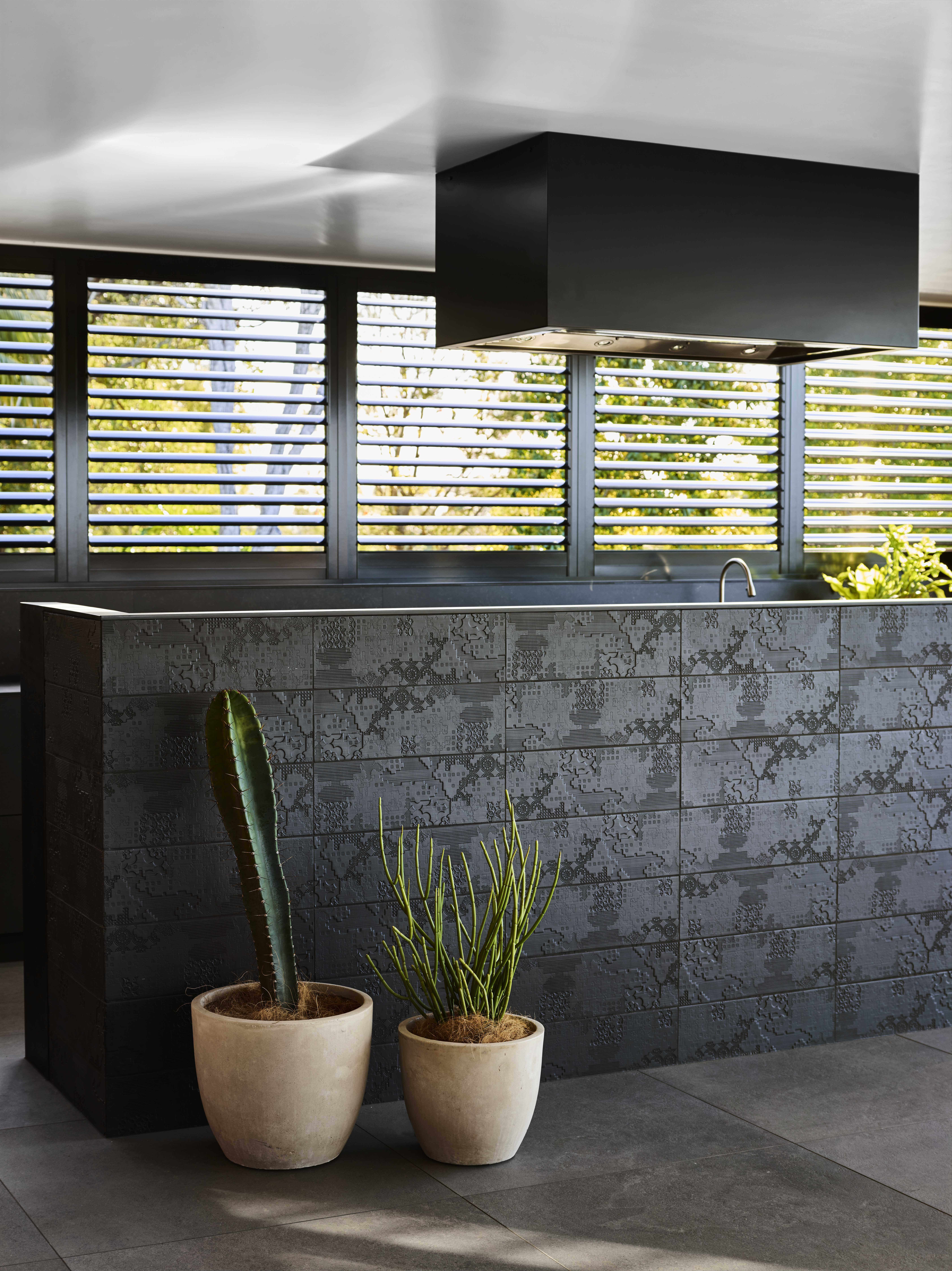 The outdoor kitchen is orientated to face into the entertaining area and open out to the pool area to create a bar like feel and encourage a social relaxed atmosphere. The modern kitchen space features a large sink, 12mm ‘Bluestone’ Laminam bench tops with 3mm ‘Nero’ Laminam drawer fronts, Tricoya waterproof carcasses & handmade Italian tiles cladding the exterior of the island wall creating an almost indestructible kitchen. Culinary pieces such as the butchers block, 2 door Marine grade stainless steel drink fridges and Smeg BBQ & Rangehood are also a feature of the kitchen which increases the usability and catering potential of the space.