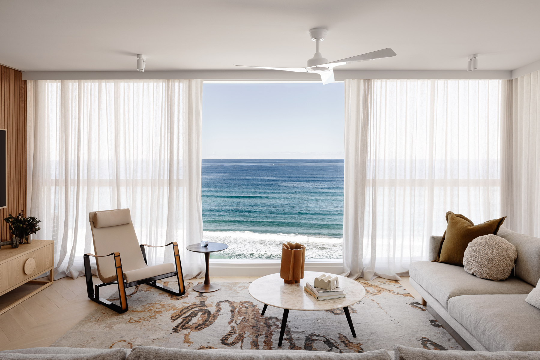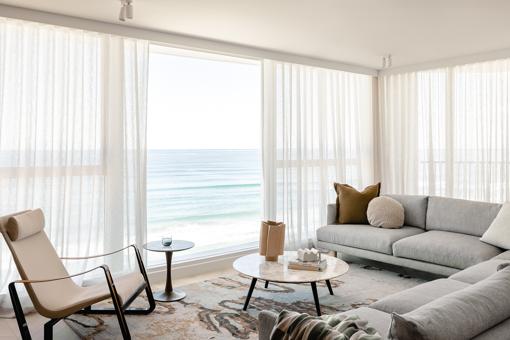 Stepping into the living space which features grand views out over the ocean, we created a wonderful space to sit back, relax and enjoy watching the surfers (and occasional whales!). Working in with the clients existing grey sectional sofa we injected a punch of interest to ground the space with the Hare + Klein ‘Scribble’ rug from Designer Rugs. The warm colourways in this beautiful rug worked back in with the tone of the wall cladding and timber flooring so well.