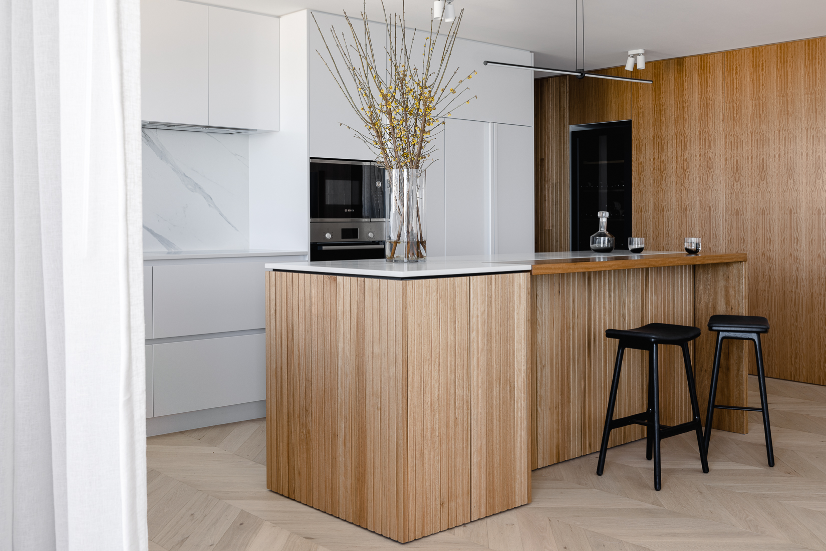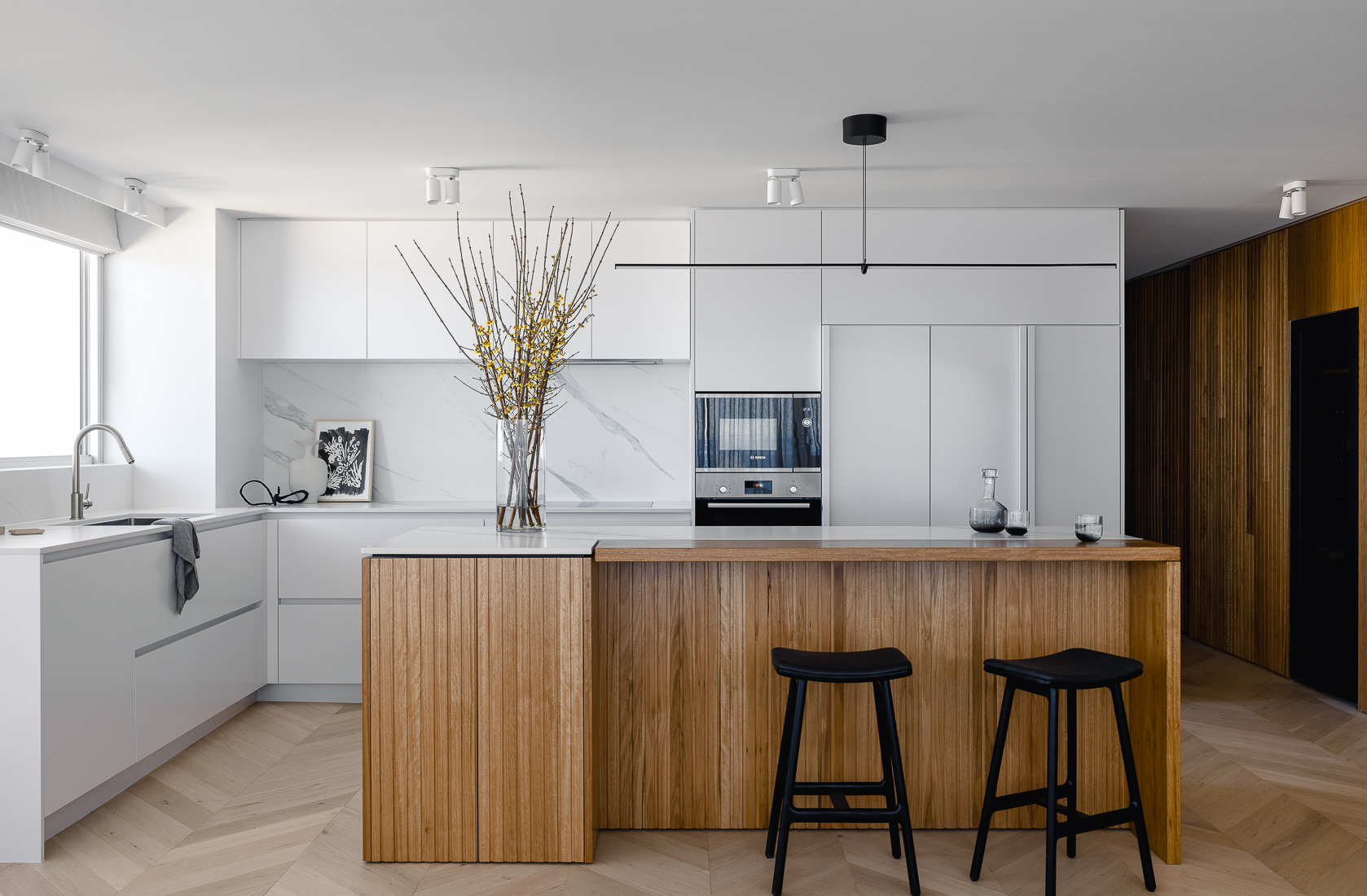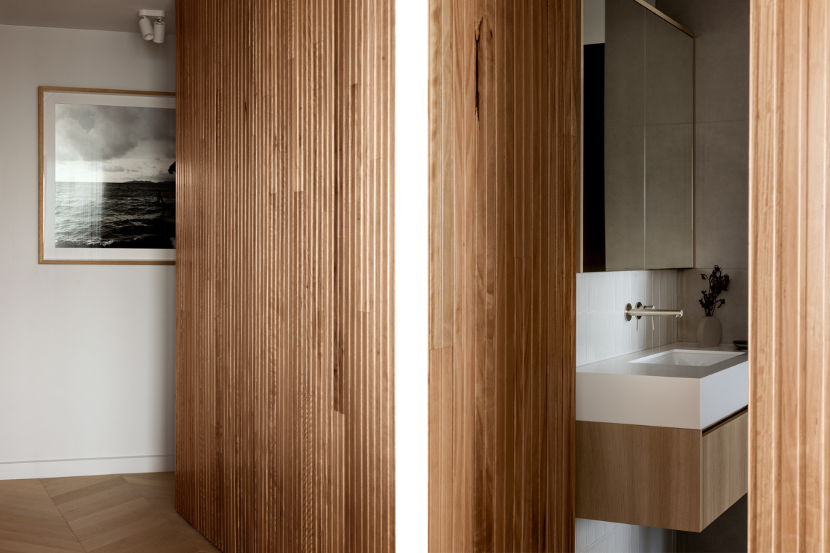 One of the hero features of the new design is the blackbutt timber cladding! Running from the apartment entry, past the bathroom and through to the Kitchen / Living spaces, the timber cladding features in a cohesive blackbutt grain mixing routed panels with large veneer flat panels. The large timber wall adds a beautiful tactile warmth to the apartment, while also disguising two ‘secret’ full height pivot doors into the Main Bathroom and Primary Bedroom. The blackbutt veneer is also carried around the kitchen island bench to link the materiality and detail.