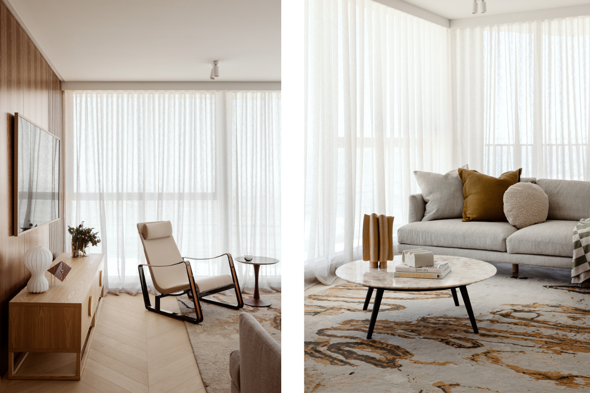 New timber flooring was laid throughout the apartment, and this completely transformed the feel of the space. We ended up going with the beautiful ‘Freado’ herringbone oak timber floor from Tongue & Groove which suited perfectly. New ceiling mounted window coverings were also selected to suit each window type, with s-wave sheers and block out roller blinds to filter out the coastal morning sun.