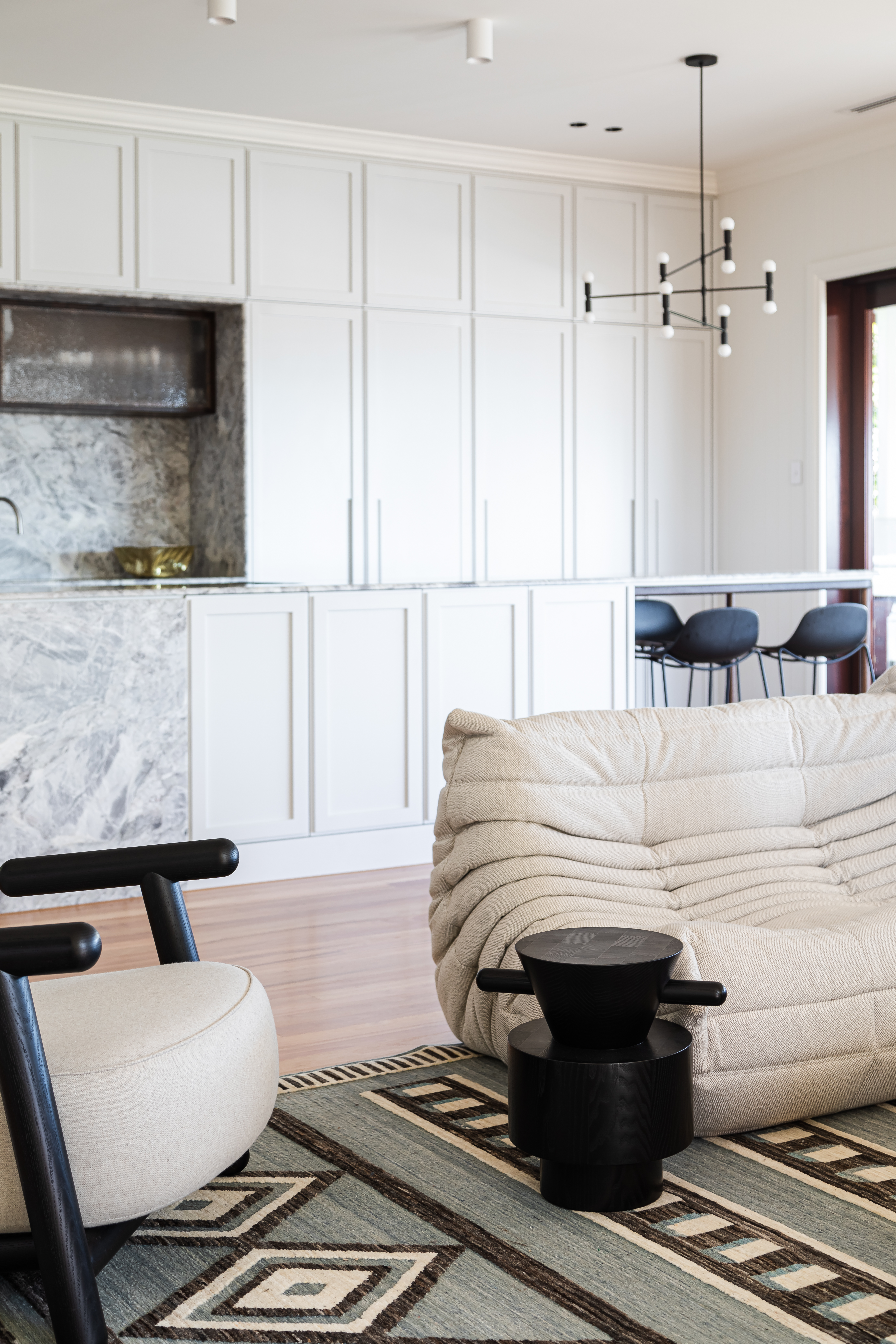 This kitchen was designed with function in mind. We gave the Clients multiple areas to eat and entertain including an adjacent dining room with a fun feature pendant from Fred International as well as typical island bench seating sat under the beautiful Atomium pendant by Lambert & Fils. With the island bench facing the new living area, we also gave the Clients an additional prep sink fit with an All-In-One ZipTap so the Clients can prep, cook, and fill up on drinks without ever having to disconnect from their family and visitors.