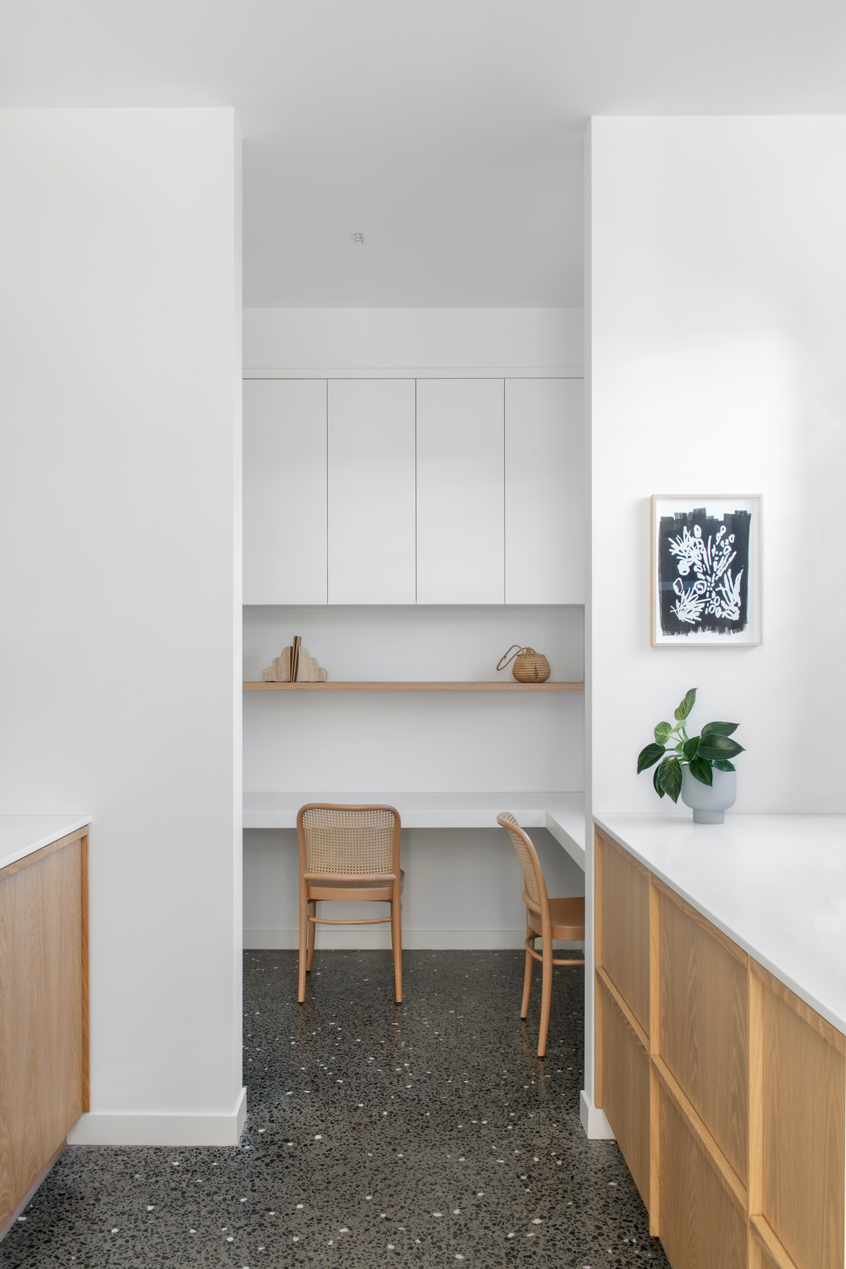 Doesn’t the Bugai Whyoulter Wantili Aboriginal artwork just look so at home in this corner of our kitchen! Complimenting the white on white textures and warmth of the oak joinery it completes the kitchen settee wonderfully.