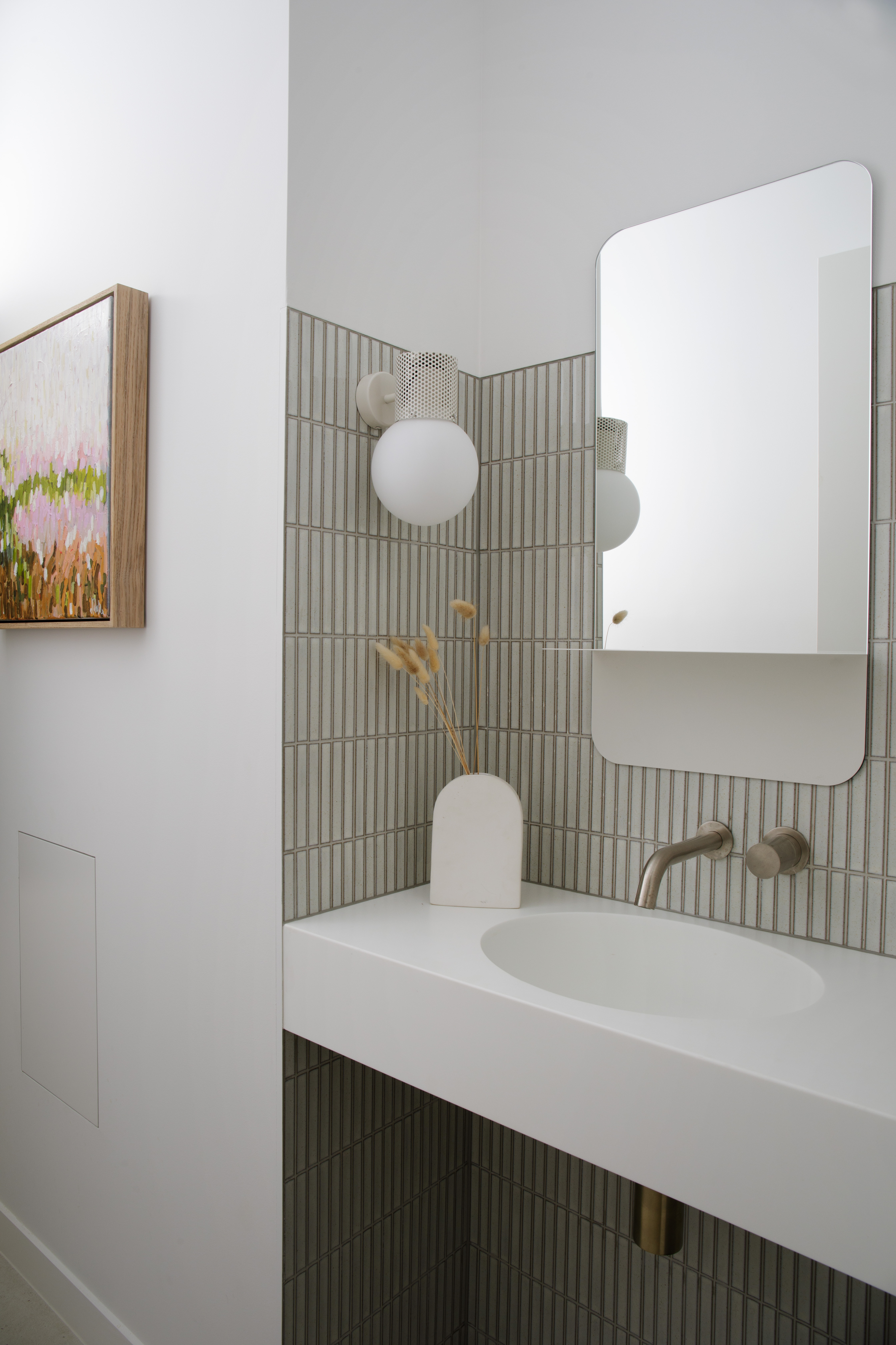 On the opposite side of the kitchen rangehood we have a small piece from the lovely Rikki Day. This oak framed work on raw cotton fabric brings an artistic point of interest to the powdercoated metal open shelf. The organic figure pairs beautifully with the rounded forms in the kitchen design!