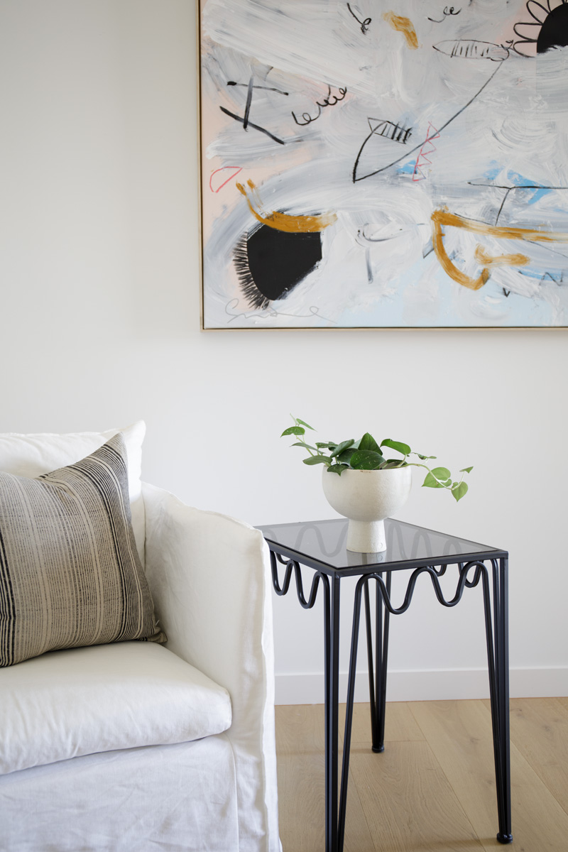 Adjacent to the other work in our Primary Bedroom we added a second Shane Bowden work to our home! Hung above the little reading chair nook, we positioned the ‘Around You’ piece horizontally on the wall. The light pink touches link in so well to the blush tones of the Armadillo rug, while the black linework complements the wavy metal work of the side table below. Shane’s expressionist paint work and washes of pastel make it a harmonious piece for our bedroom.