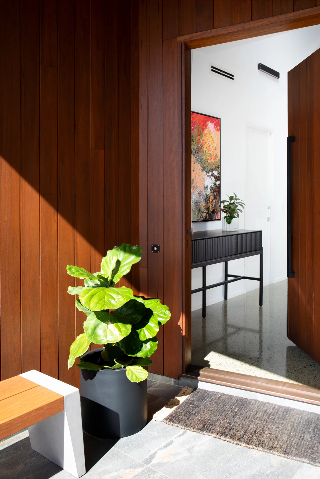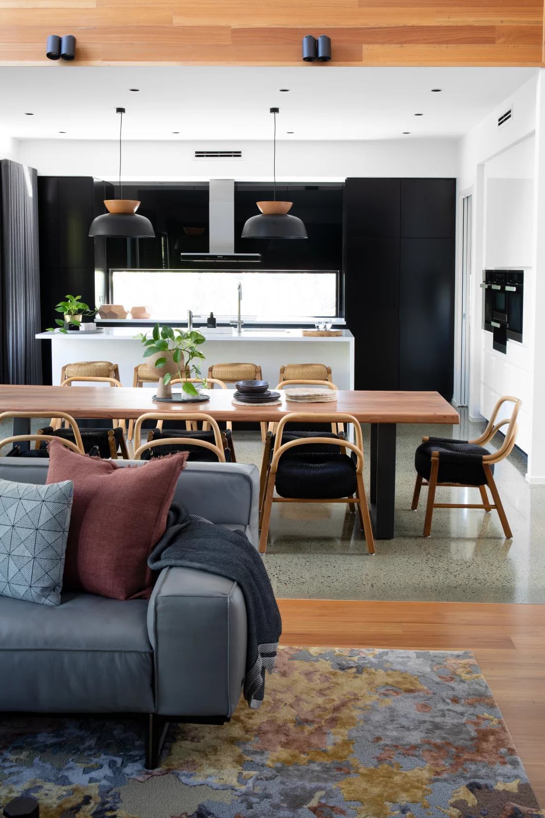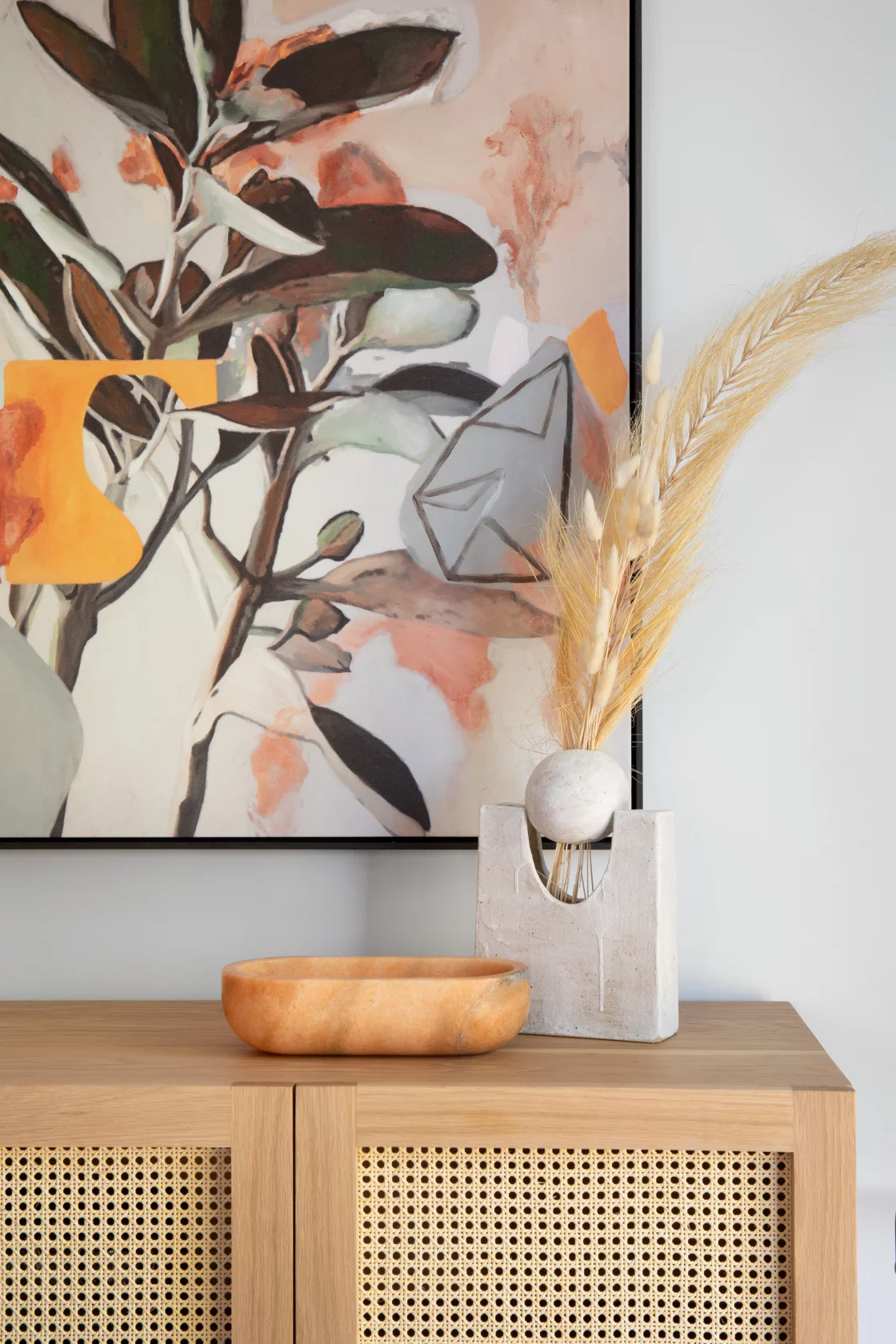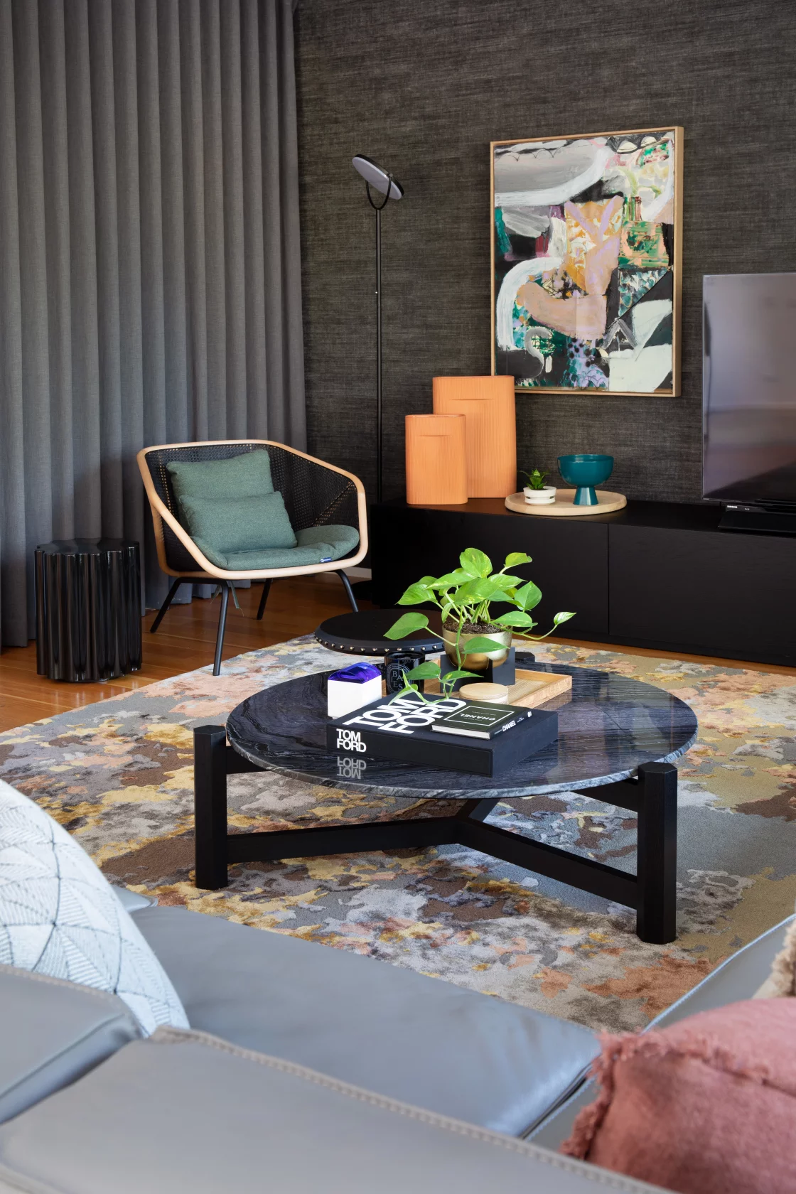The living area combines earthy tones, plush textures, and modern artwork, creating a cozy yet bold space perfect for family gatherings.