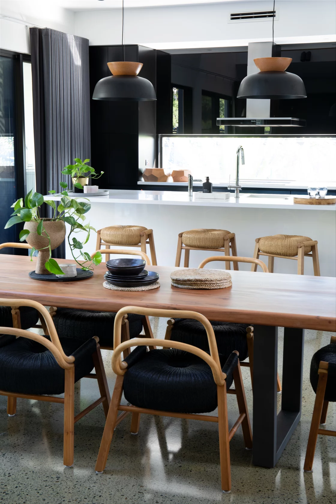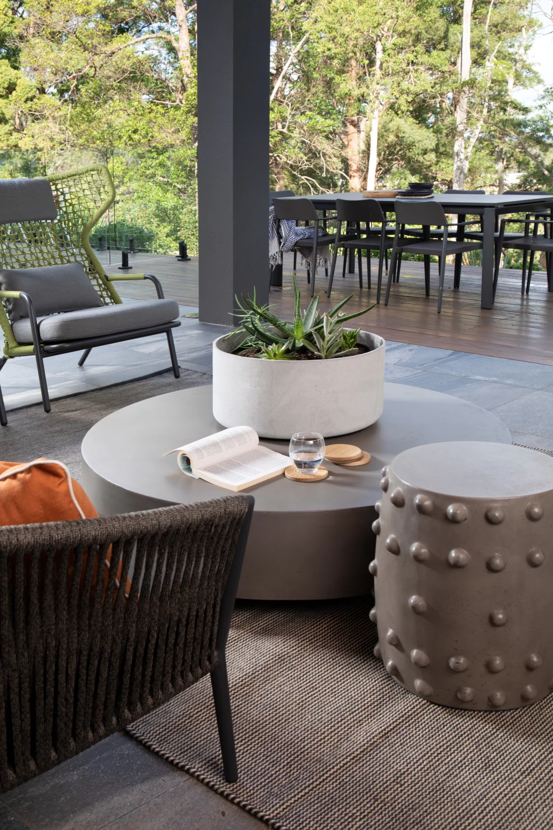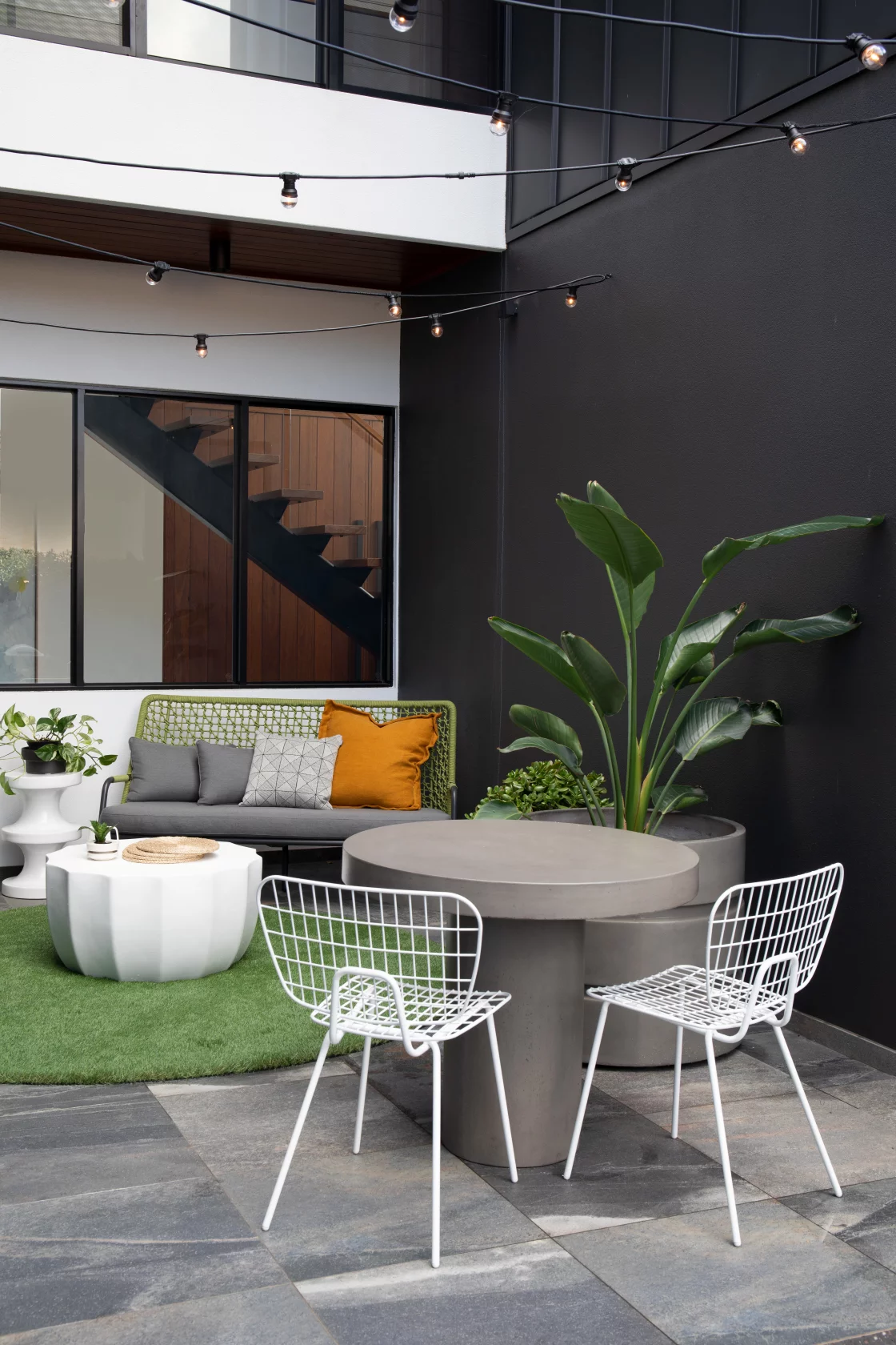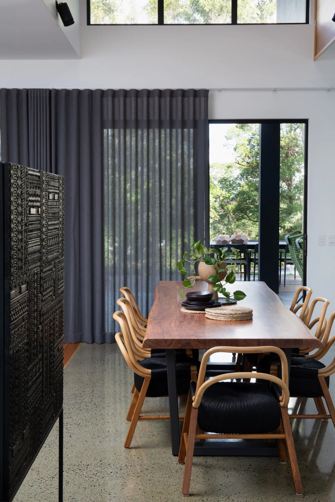 The living area combines earthy tones, plush textures, and modern artwork, creating a cozy yet bold space perfect for family gatherings.