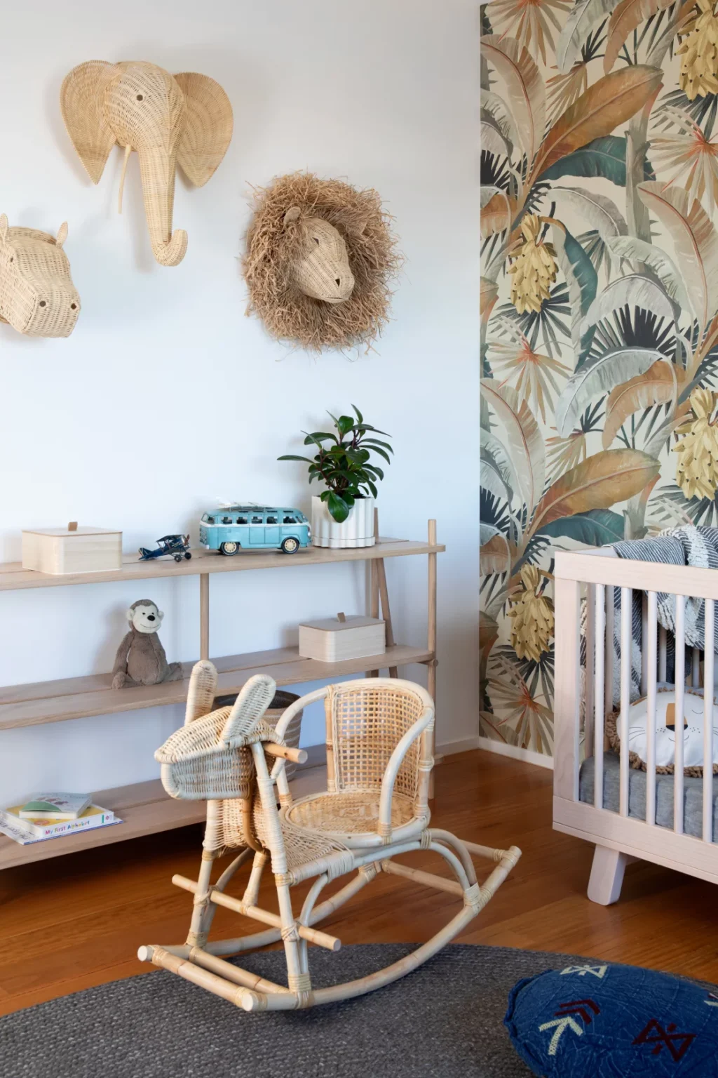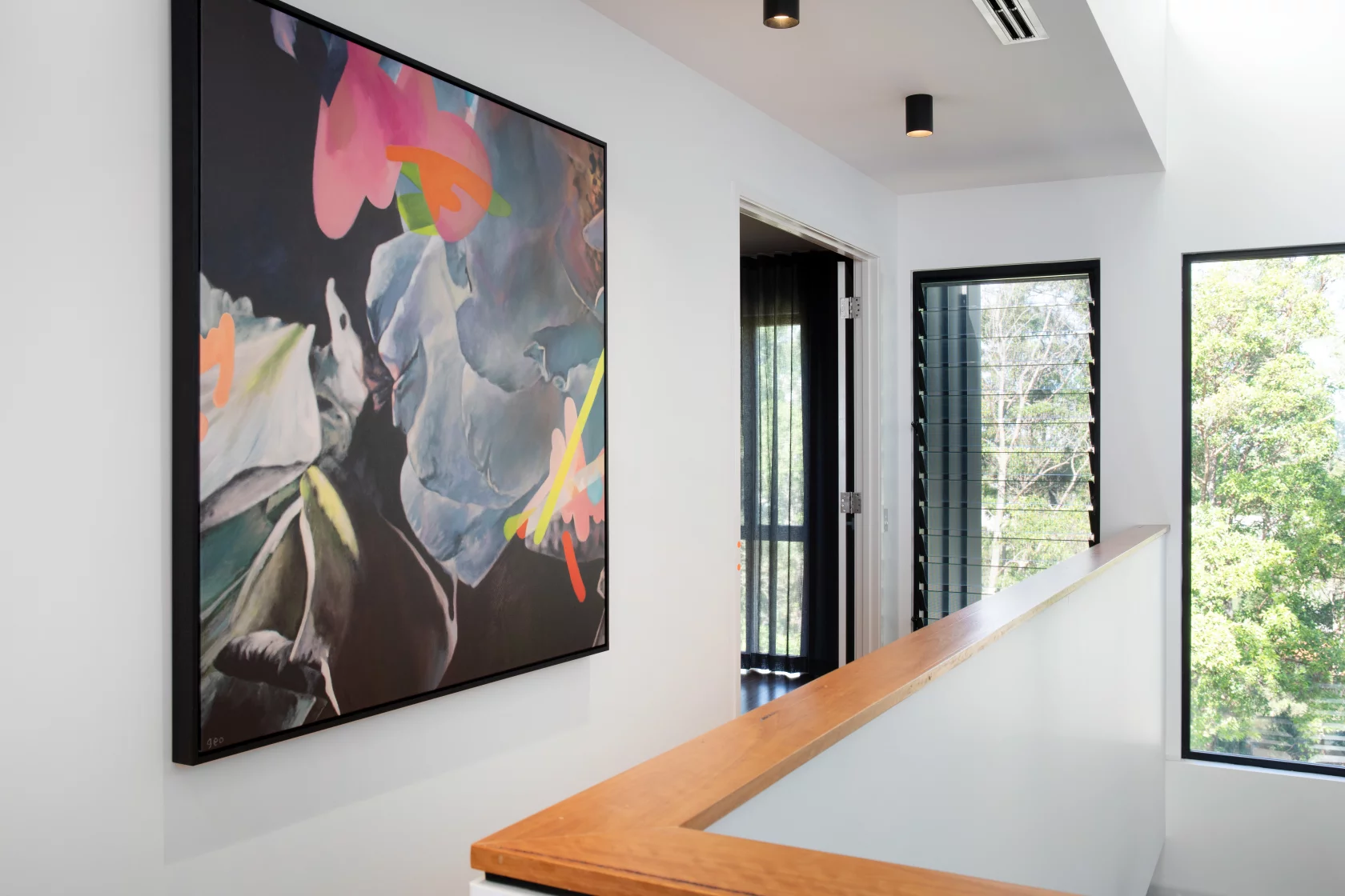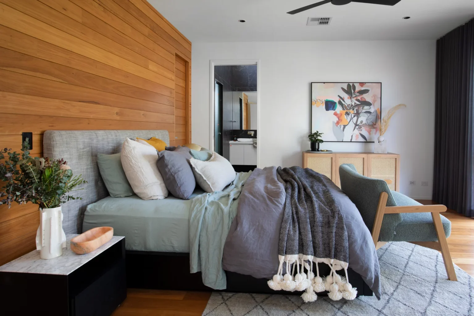 The master suite offers a serene retreat with soft furnishings, an oversized rug, and statement floral artwork that adds a touch of elegance.