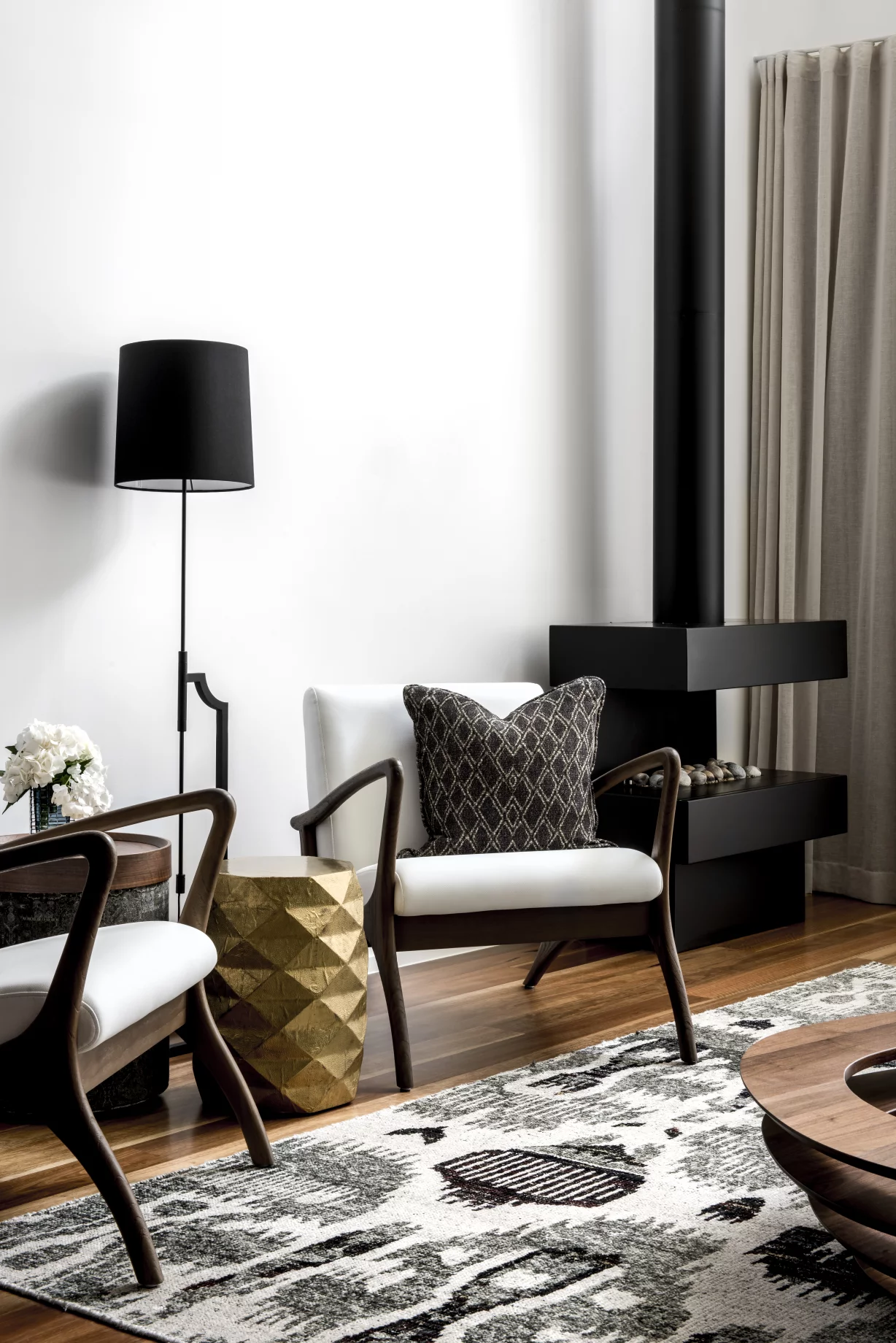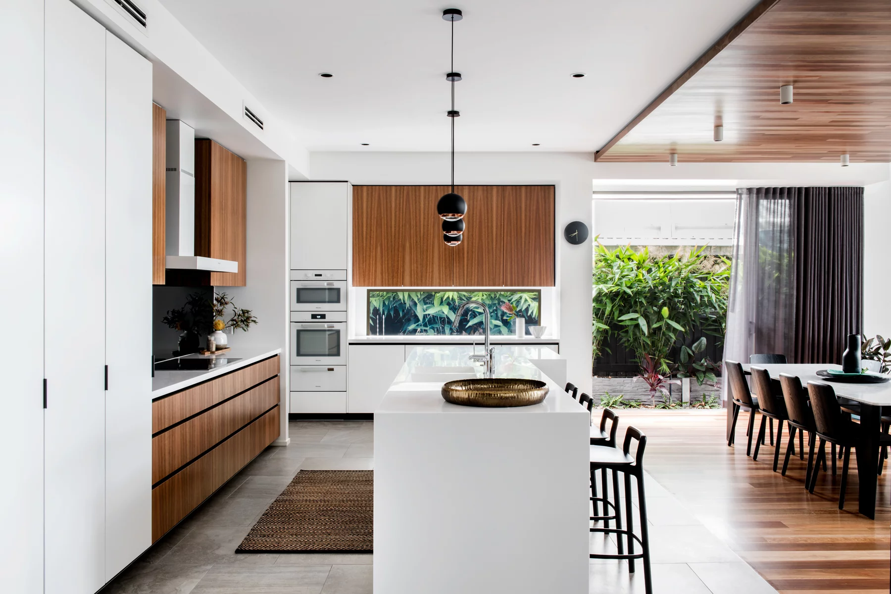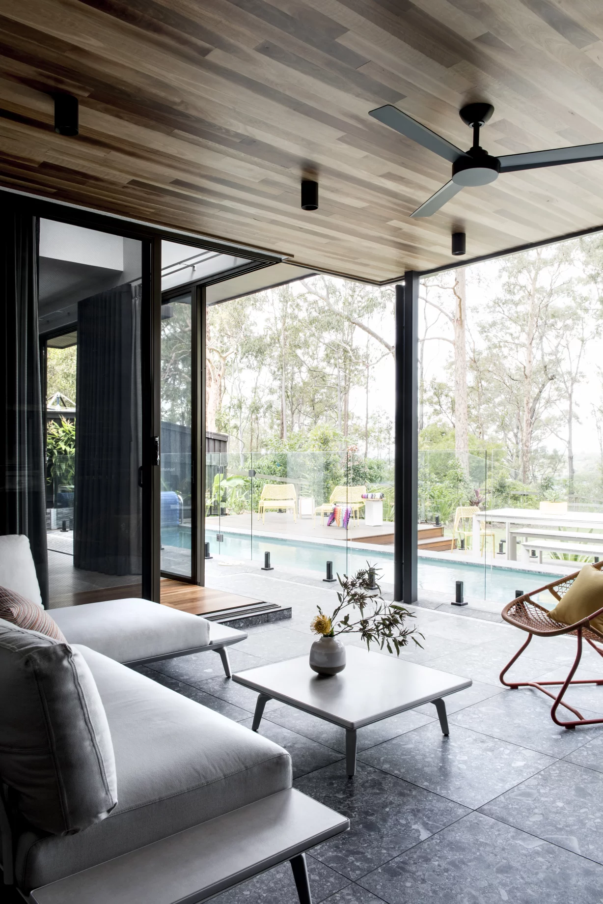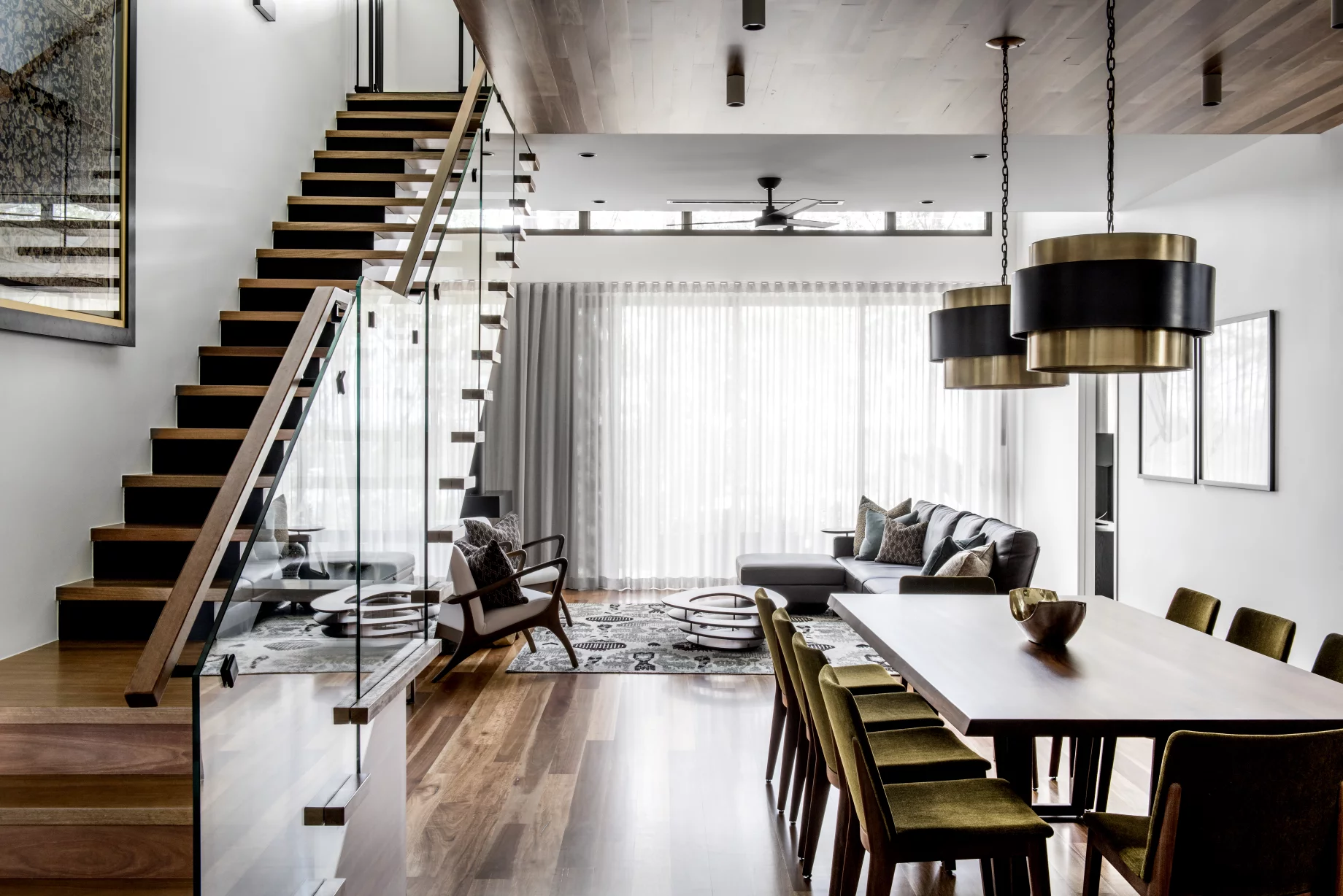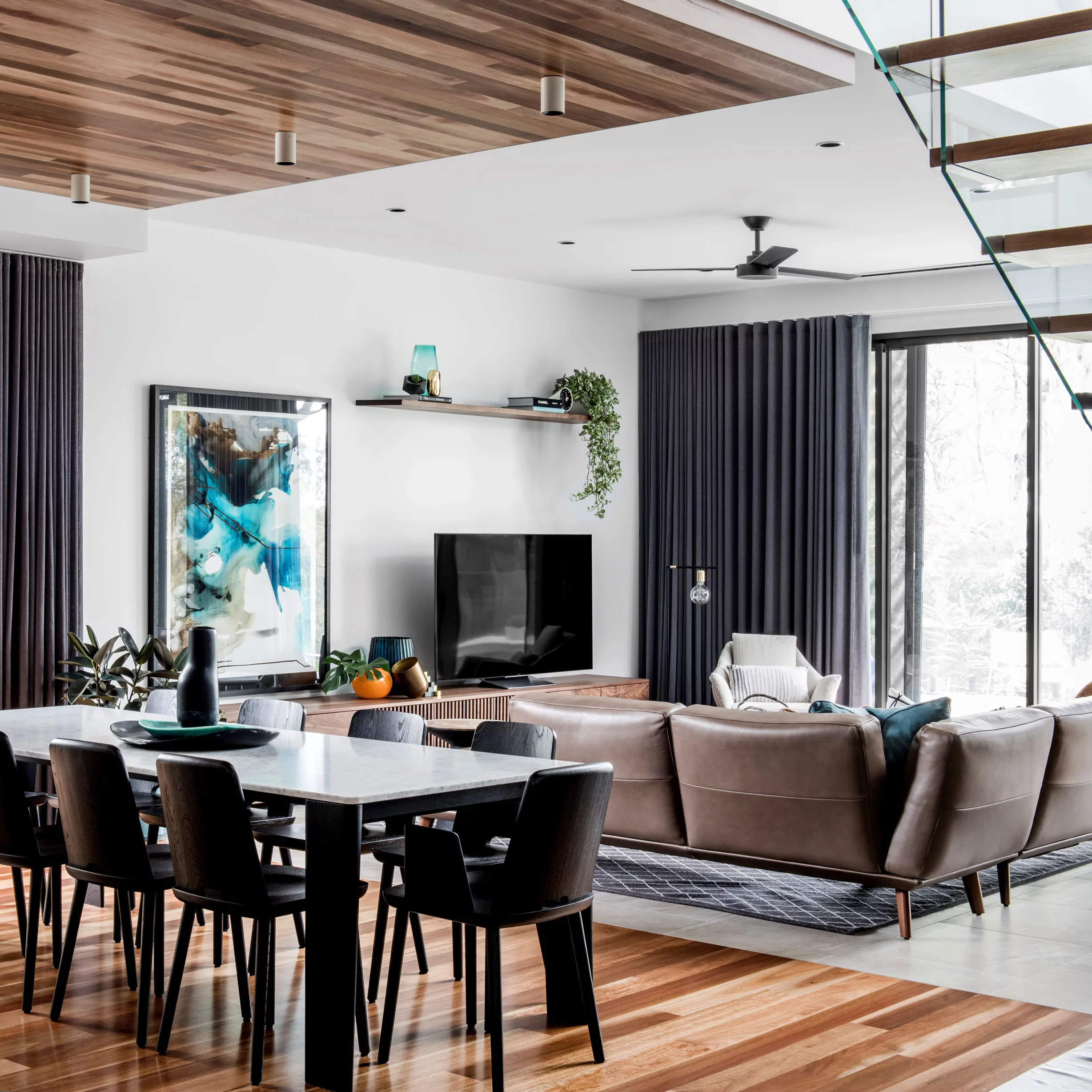 The Underwood Residence is a striking family home designed to balance dramatic aesthetics with functional living. Featuring a bold matte-black kitchen, earthy tones, and natural textures like timber and rattan, the home is both sophisticated and inviting. With seamless indoor-outdoor flow and spaces tailored for entertaining, the design embraces its bushland surroundings while catering to modern family life.