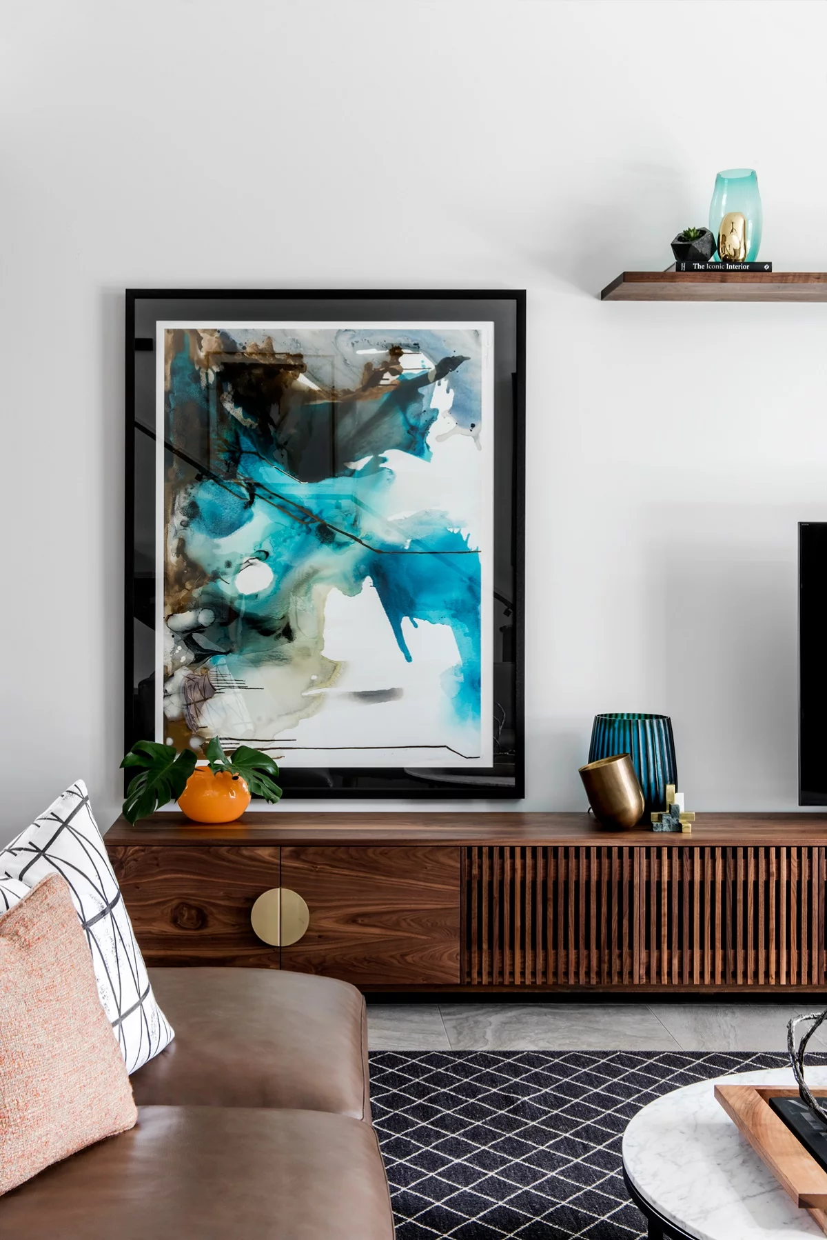 The living room blends earthy tones, modern artwork, and bespoke furnishings, creating a cozy yet sophisticated space for family gatherings. Thoughtful design details, like custom joinery and layered textures, enhance the room’s warmth and functionality.