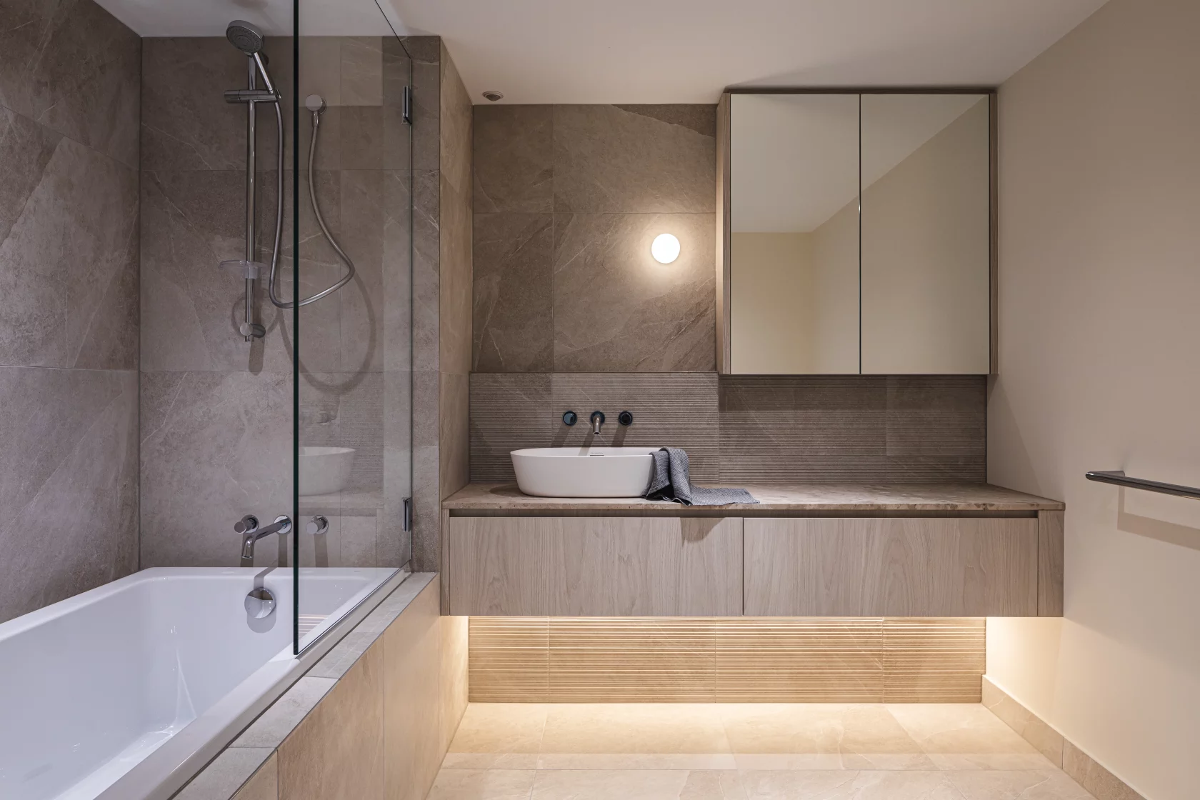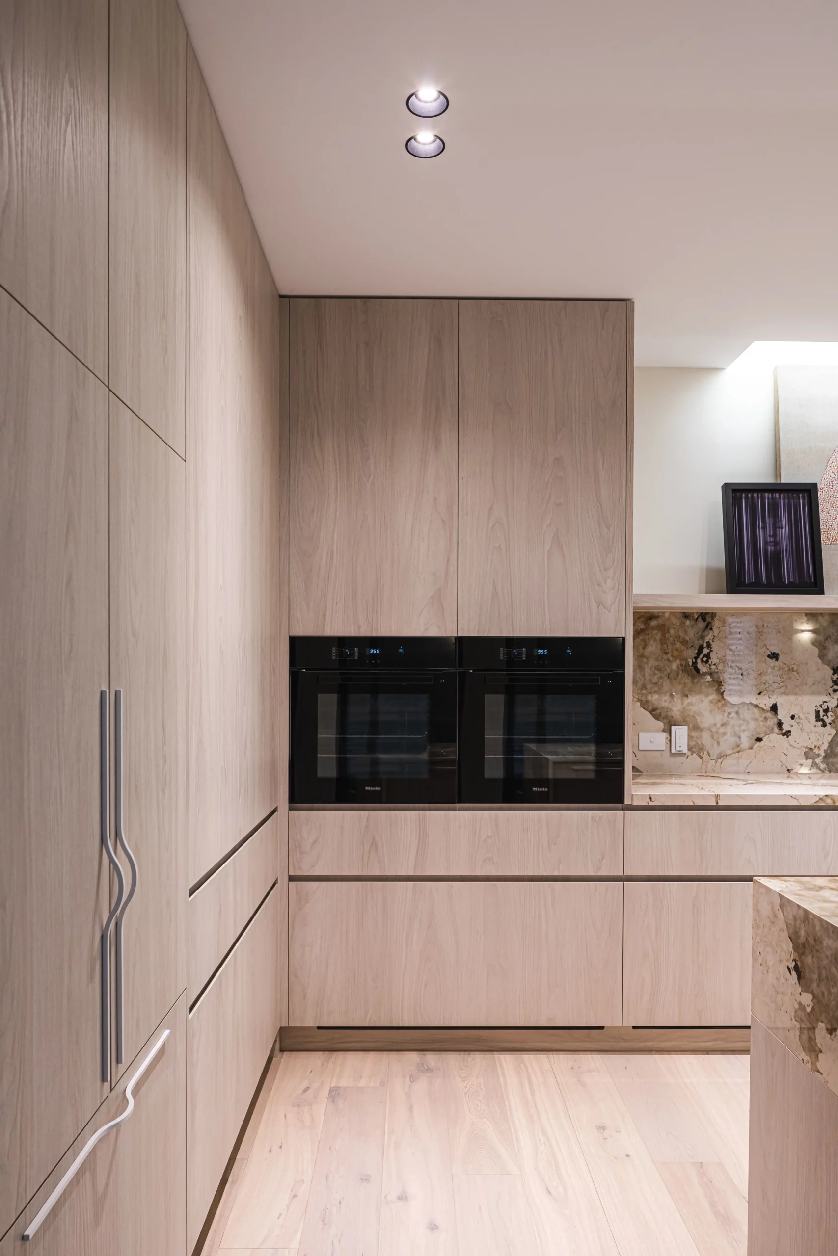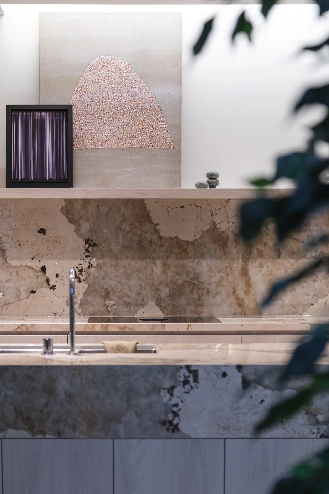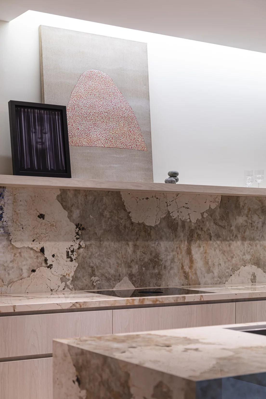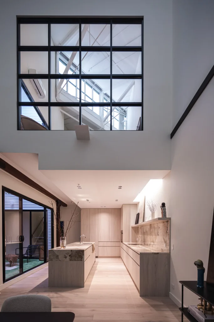 The design team adopted a neutral palette and minimalist approach to revitalize the kitchen, living area, and atrium. This strategy not only modernized the apartment but also highlighted the building’s original architectural features. The atrium, serving as a central focal point, was meticulously designed to enhance natural light and create a sense of openness throughout the living spaces.