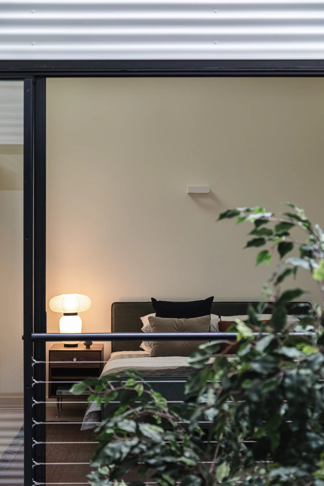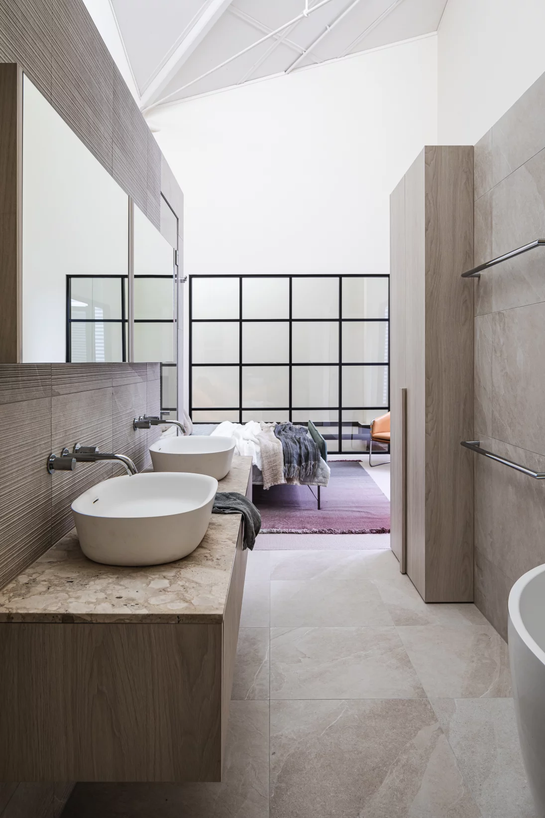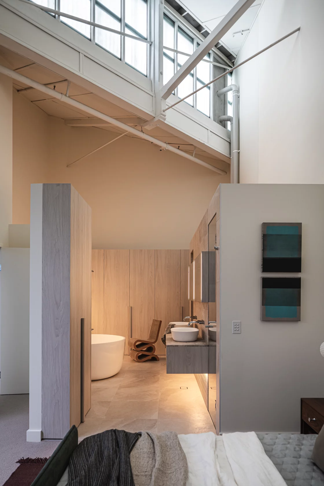 In the primary suite, the layout was reimagined to improve functionality and aesthetics. Full-height walls were introduced to enclose the space, eliminating the need for ceilings and revealing the character-filled sawtooth roof and large windows. A substantial fixed window was added to the void wall in the bedroom, providing much-needed natural light to the dining room below. The ensuite was expanded by relocating existing bathroom and laundry areas, allowing for a spacious bathroom featuring a double vanity, separate shower, and toilet areas. The suite boasts a calming essence with its soft, natural palette, including plush wool carpets, full-height porcelain tiles, and Santa Monica Limestone benchtops.
