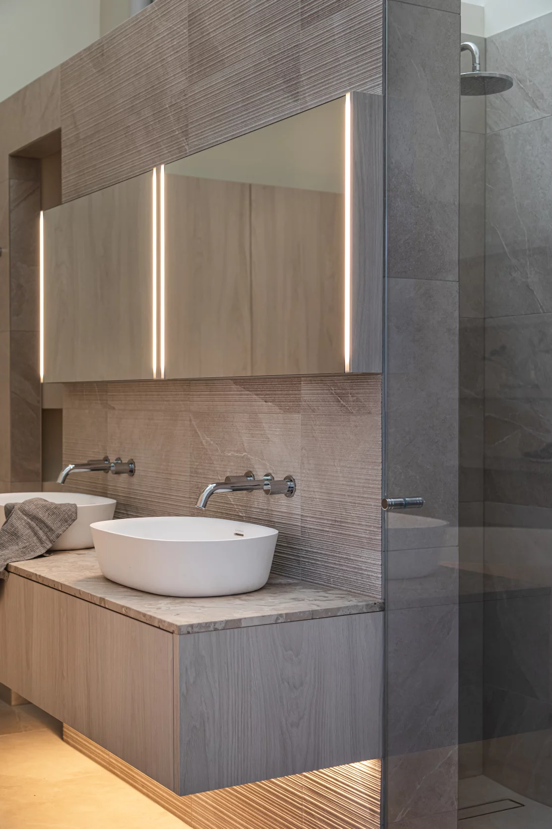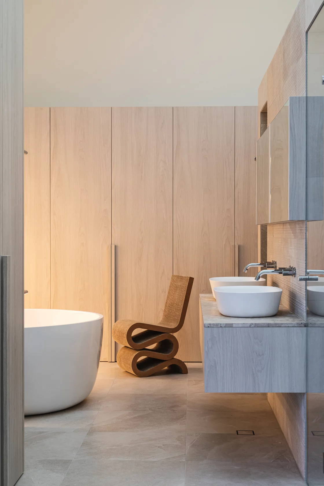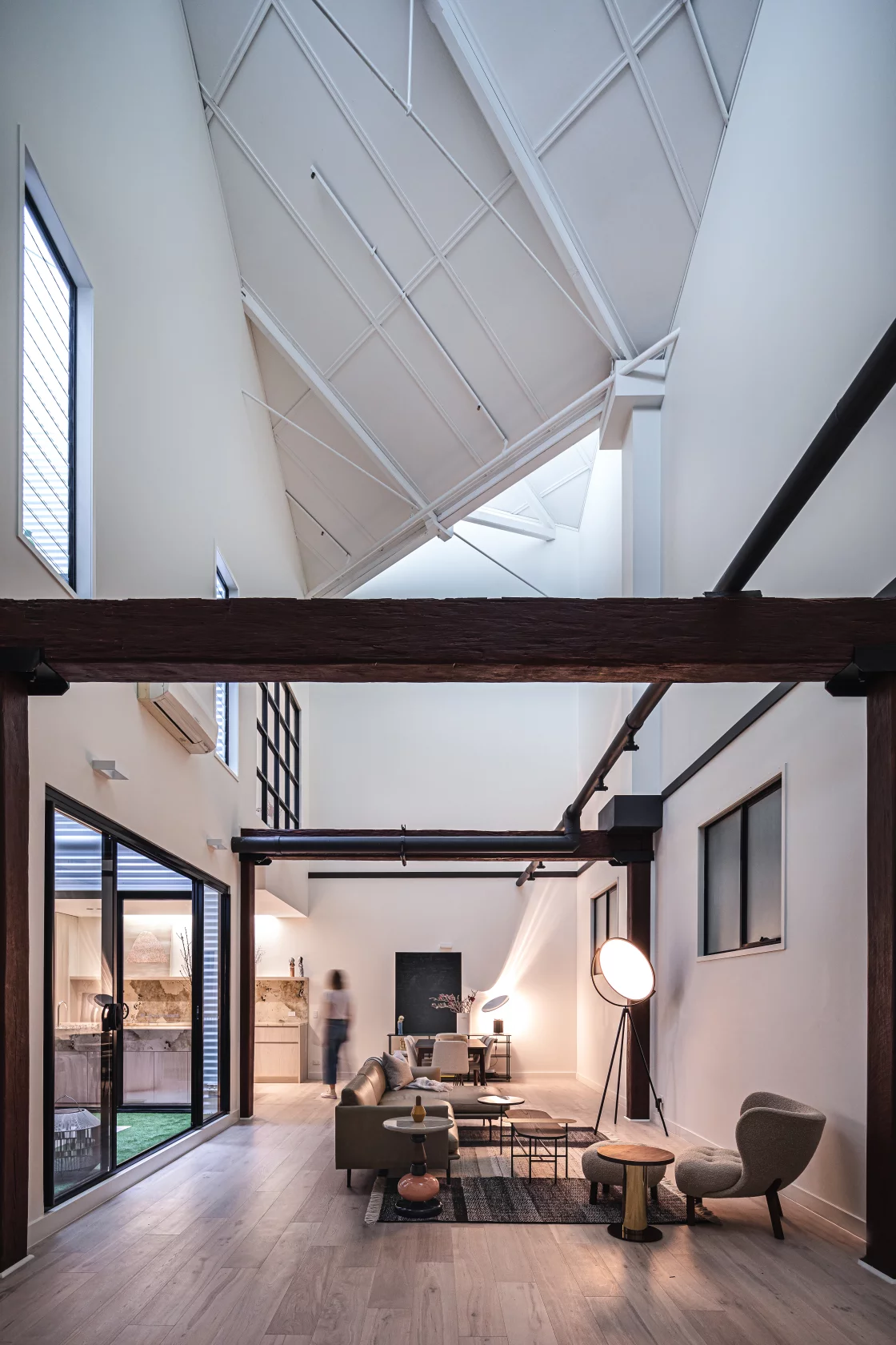 In the primary suite, the layout was reimagined to improve functionality and aesthetics. Full-height walls were introduced to enclose the space, eliminating the need for ceilings and revealing the character-filled sawtooth roof and large windows. A substantial fixed window was added to the void wall in the bedroom, providing much-needed natural light to the dining room below. The ensuite was expanded by relocating existing bathroom and laundry areas, allowing for a spacious bathroom featuring a double vanity, separate shower, and toilet areas. The suite boasts a calming essence with its soft, natural palette, including plush wool carpets, full-height porcelain tiles, and Santa Monica Limestone benchtops.